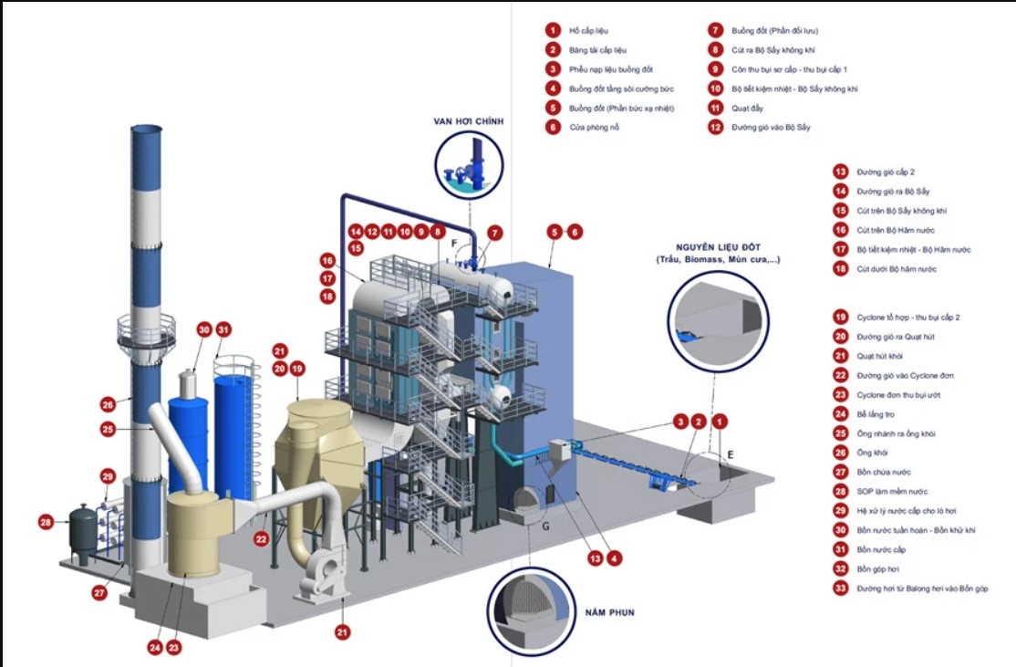 - Sử dụng đa dạng nhiên liệu: từ than đá, sinh khối (trấu, mùn cưa, vỏ hạt điều…), đến rác thải công nghiệp.